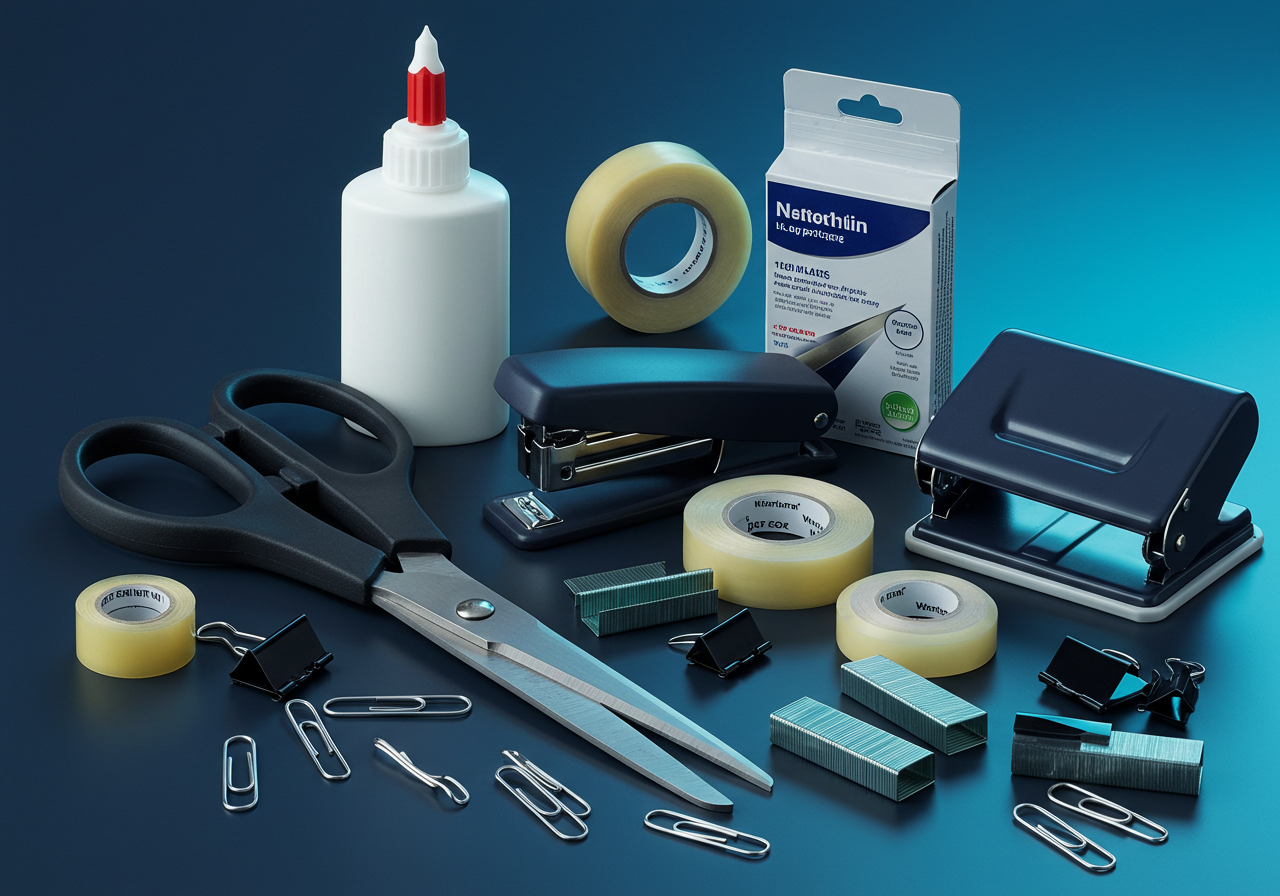 Equipa tu espacio con tijeras, engrapadoras, perforadoras y accesorios básicos como clips, grapas, cintas adhesivas y pegamentos. Todo lo que necesitas para el día a día de manera práctica.